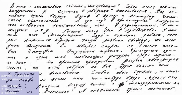 В письме, отправленном 8 января 1968 года своему другу Игорю Кохановскому, который в то время работал в Магадане, Владимир Высоцкий рассказал о своих впечатлениях после недавних выступлений в Куйбышевском Дворце спорта: